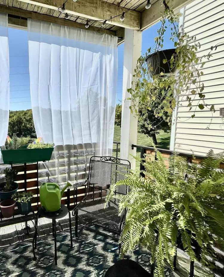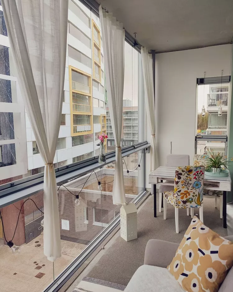 پرده ها یک راه حل معمول برای حفظ حریم خصوصی بیشتر در بالکن است. می توان پشت پرده ها را با طناب کنفی بست که هنگام وزش باد پرده ها را بلند نکند. استفاده از رنگ سفید به شما کمک می کند تا کمتر احساس تاریکی کنید و در این صورت از نور خورشید هم می توانید استفاده کنید.
