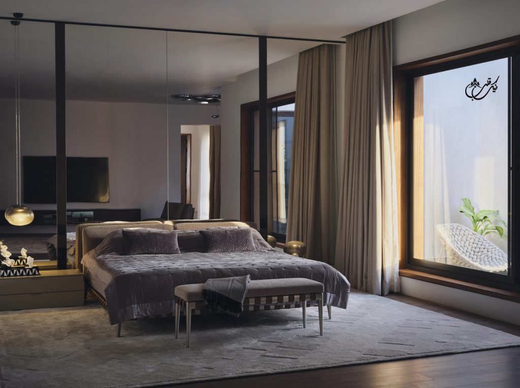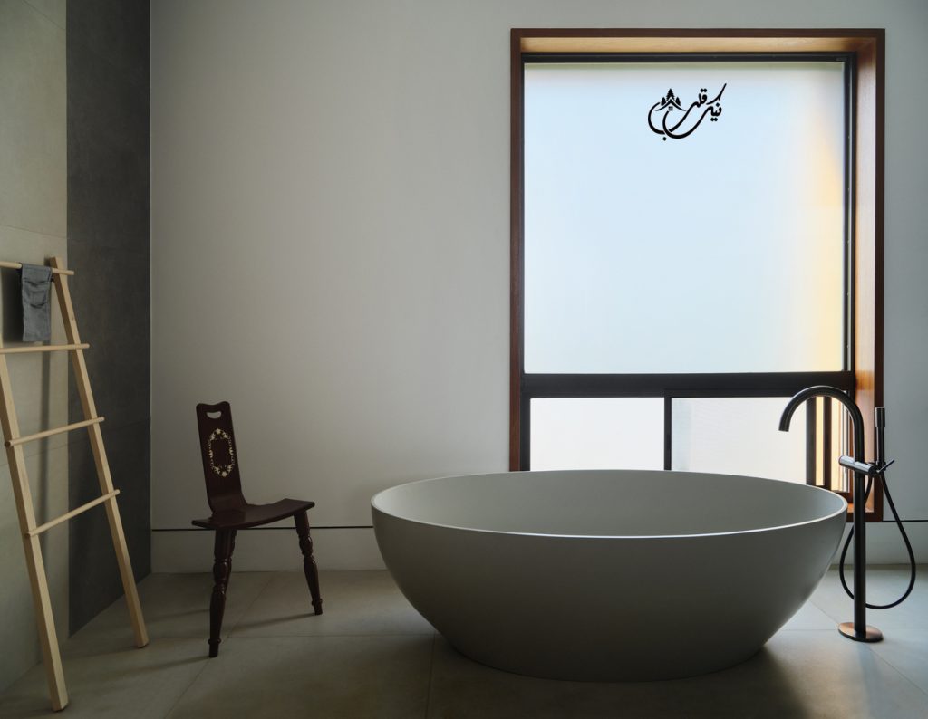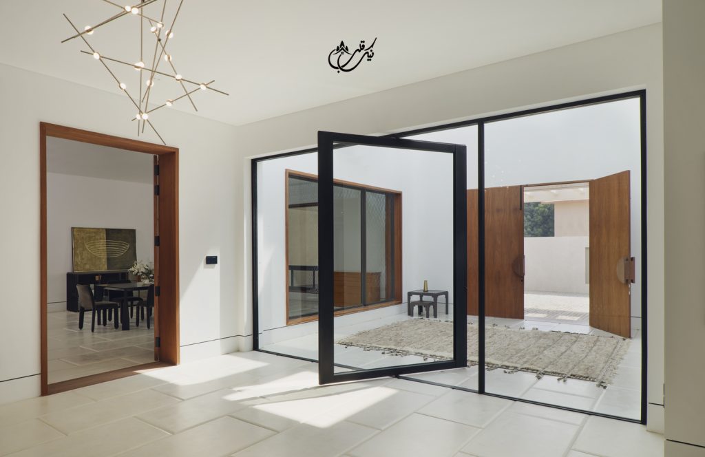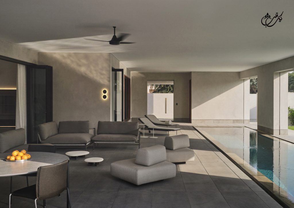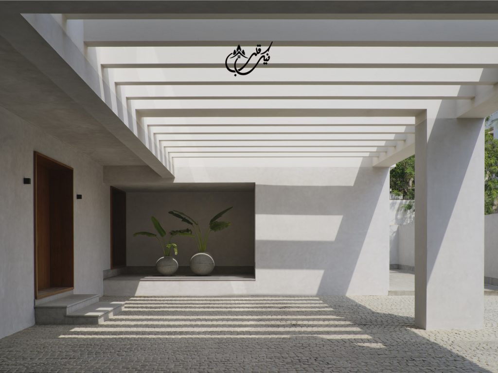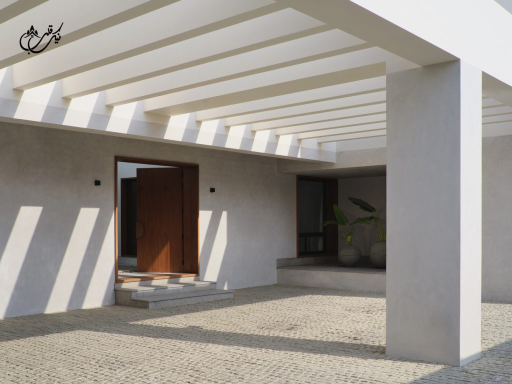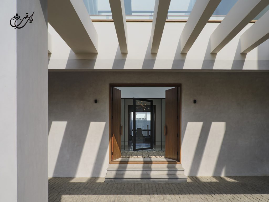 با طراحی دو ورودی برای ویلا مالک فضاهای متمایزی را تجربه می کند. پاسیویی آرام و ساکت و استخری که برای رسیدن به آن باید از یک درب شیشه ای بزرگ عبور کنید. درب ورودی دیگر از چوب ماهون دوبل ساخته شده است. مرکز ویلا به دلیل وجود پاسیو با نور همیشه در حال تغییر است چون طلوع و غروب خورشید بسیار بر این ویلا موثر می باشد. فرم باز شدن پنجره های این ویلا دعوت می کند تا خورشید گرم کراچی وارد بنا شده و مستقیما بر تمام عناصر ویلا خود را بتاباند.