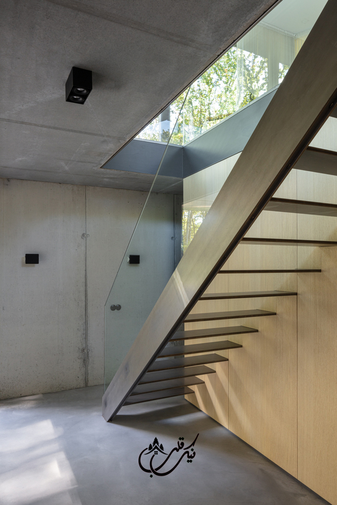 این ویلا دو طبقه است که طبقه بالا بر روی زمین و طبقه پایین به صورت تقریبی زیر زمین قرار گرفته است. دسترسی به سالن ورودی از قسمت بالای ویلا میسر است و سپس شما را با استفاده از یک پلکان خوش ساخت به سمت طبقه همکف هدایت می کند که این بخش سالن نشیمن یا پذیرایی را هم شامل می شود. در طبقه همکف فضای نهار خوری، یک اتاق مطالعه و یک اتاق خواب مستر با حمام اختصاصی قرار دارد. چیدمان زاویه دار فضای نشیمن منظره ای متفاوت از طبیعت محیط اطراف را به هر اتاق ارائه می دهد. ارتفاع جزئی این طبقه از سطح زمین منظره ای بی نظیر ایجاد می کند و مانند این است که در میان تنه درختان زندگی می کنید و انگار بخشی از جنگل هستید.